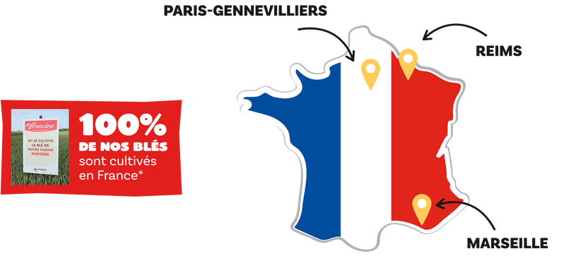 100 % de nos blés sont cultivés en France* et 100 % de nos farines y sont produites ! Grâce à nos agriculteurs partenaires, nous garantissons une farine de qualité, produite dans nos 3 moulins répartis sur le territoire français.